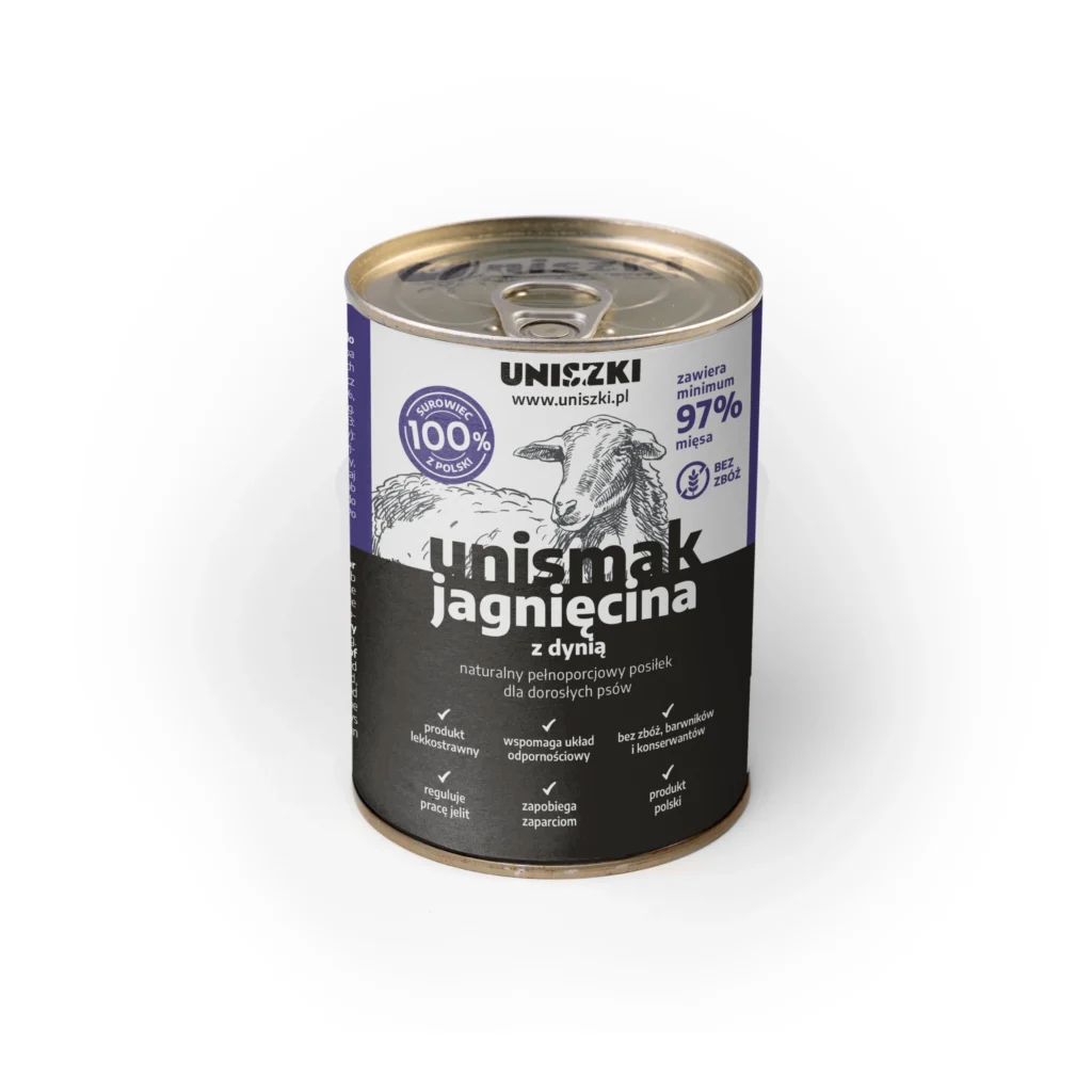 Jeśli szukasz karmy, która nie tylko smakuje, ale realnie wspiera zdrowie Twojego pupila, to UNIsmak z jagnięciną i dynią ma to wszystko, Pełnoporcjowy, naturalny posiłek stworzony z myślą o dorosłych psach, także tych z wrażliwym układem pokarmowym. Jagnięcina dostarcza wysokiej jakości białka, witamin (szczególnie z grupy B) oraz minerałów takich jak żelazo, cynk i fosfor. Szczególnie jest to korzystne dla psów aktywnych, szczeniąt i psów w okresie rekonwalescencji.